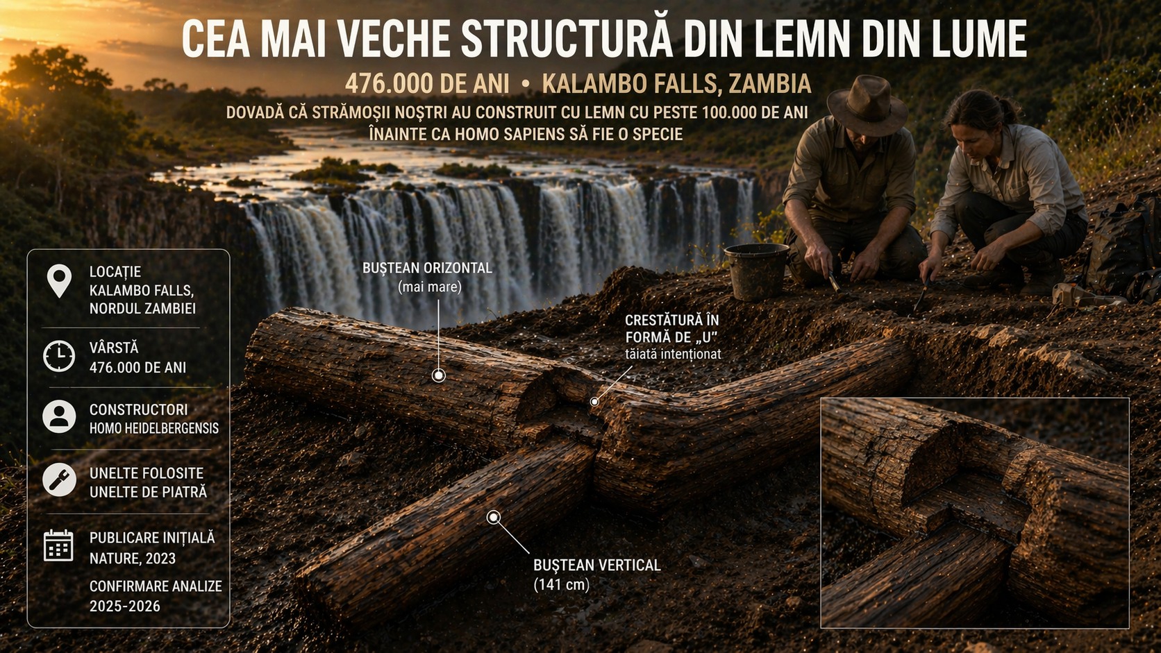 La marginea cascadei Kalambo din Zambia, arheologii au descoperit ceva care răstoarnă o presupunere centrală a paleo-antropologiei: două bușteni de lemn crestați și îmbinați deliberat, vechi de 476.000 de ani. Asta înseamnă că strămoșii noștri au construit cu lemn cu peste 100.000 de ani înainte ca Homo sapiens să fie o specie. Descoperirea, publicată inițial în Nature și confirmată prin noi analize în 2025-2026, e considerată cea mai veche structură din lemn din lume.