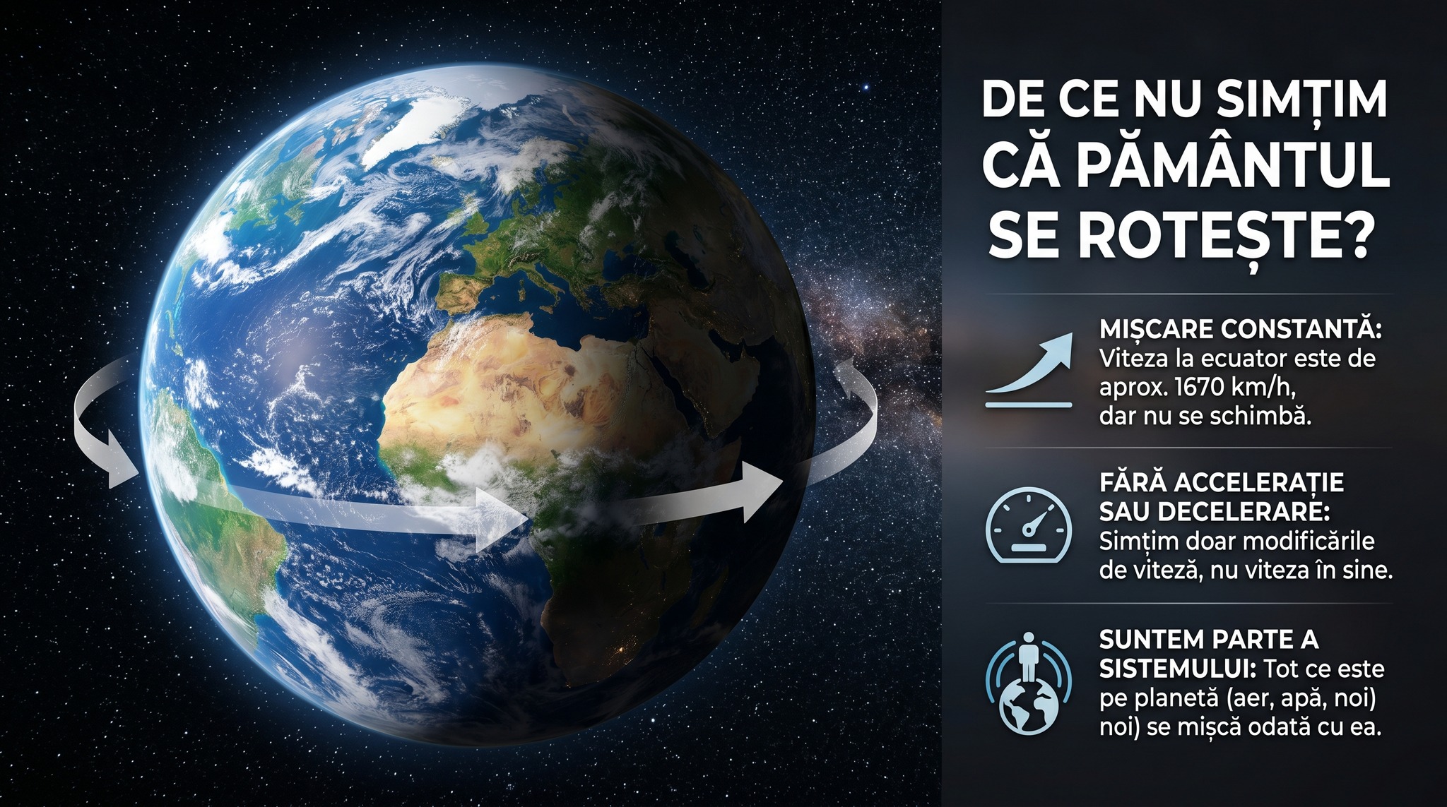 Ceea ce organismul uman detectează nu este viteza, ci accelerația — adică modificarea vitezei sau a direcției. Simți când avionul accelerează pe pistă, simți când frânează, simți turbulențele. Dar zborul lin, constant? Nu-l simți. Pământul se rotește lin și constant de 4,5 miliarde de ani. Nu există nimic de simțit.