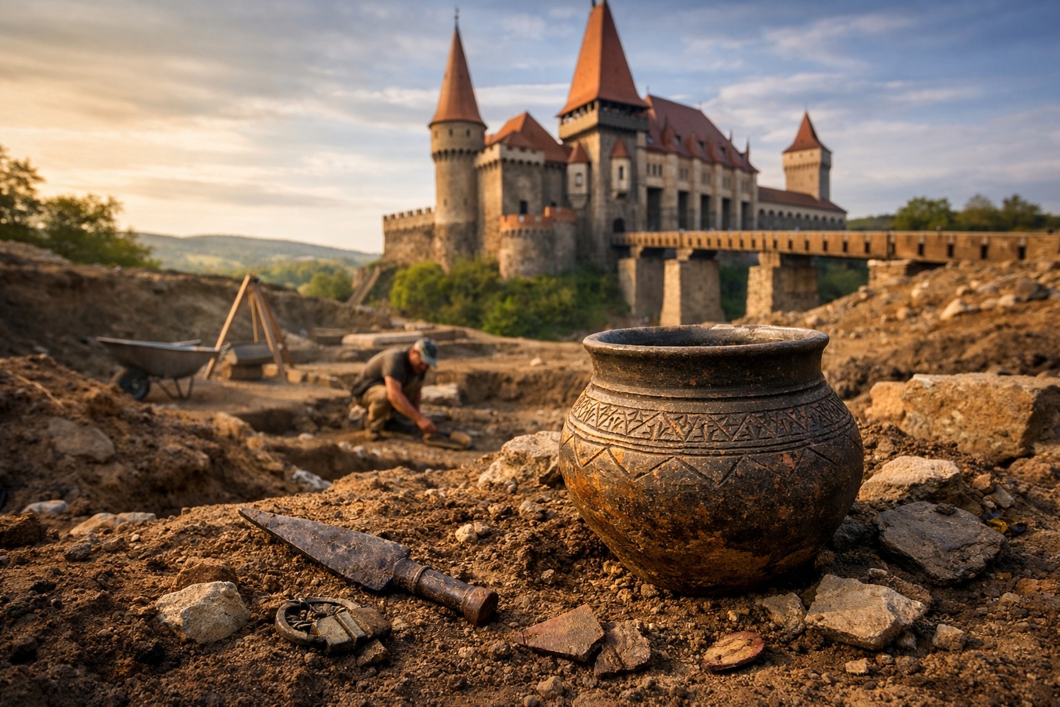 Marți, 14 aprilie 2026, Muzeul Castelul Corvinilor din Hunedoara a anunțat o descoperire arheologică importantă: în cadrul lucrărilor de restaurare finanțate prin PNRR, în imediata apropiere a celebrului castel medieval au fost scoase la lumină obiecte vechi de peste 2.500 de ani, datând din prima epocă a fierului — perioada Hallstatt (1.200-450 î.Hr.). Printre descoperiri se numără și un vas ceramic specific acestei perioade, care confirmă ceea ce arheologii bănuiau de mult timp: zona Hunedoarei a fost intens locuită cu mult înainte ca Ioan de Hunedoara să-și înceapă celebrul castel, încă din Paleolitic.