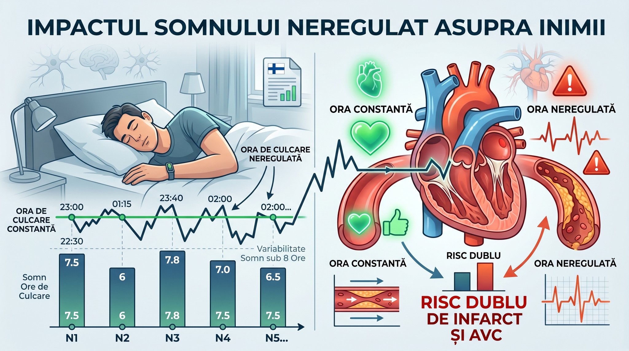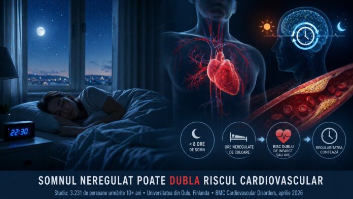 Un studiu publicat la începutul lui aprilie 2026 în revista BMC Cardiovascular Disorders ridică o întrebare pe care majoritatea o ignorăm: contează cât dormi, sau contează și la ce oră te culci? Cercetătorii de la Universitatea din Oulu, Finlanda, au urmărit 3.231 de persoane timp de peste 10 ani și au descoperit ceva important — un program neregulat de somn la vârsta adultă poate dubla riscul de infarct sau accident vascular cerebral, mai ales dacă dormi mai puțin de 8 ore.